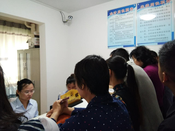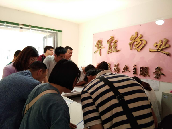 經(jīng)過(guò)各部門領(lǐng)導(dǎo)的精心帶領(lǐng)下及各單位同事的幫忙努力下一天的工作終于落幕,順利收房82戶。(圖為前臺(tái)收房及收費(fèi)室)  石婷